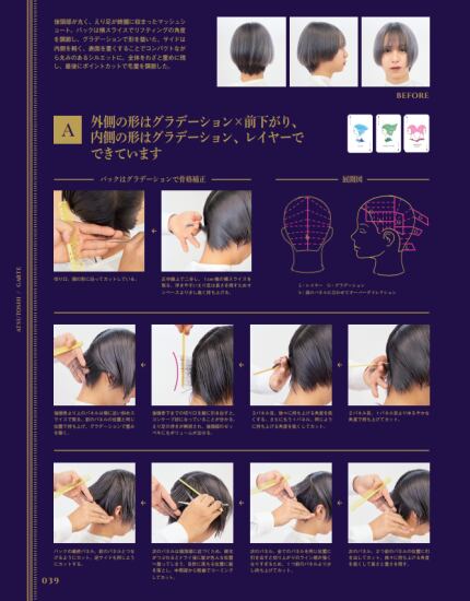 スタイルごとに、切り方を暗記してカットしていませんか? ATSUTOSHI流カットは基礎的な「レイヤー」「グラデーション」の2つの技術と「前下がり」「前上がり」「平行」の3つの形を組み合わせてオーダーメイドで当てはめるから、どんな人のどんなスタイルも自由自在。モデル11体とウイッグ8台の計19スタイルで、本物のカットが身につく。